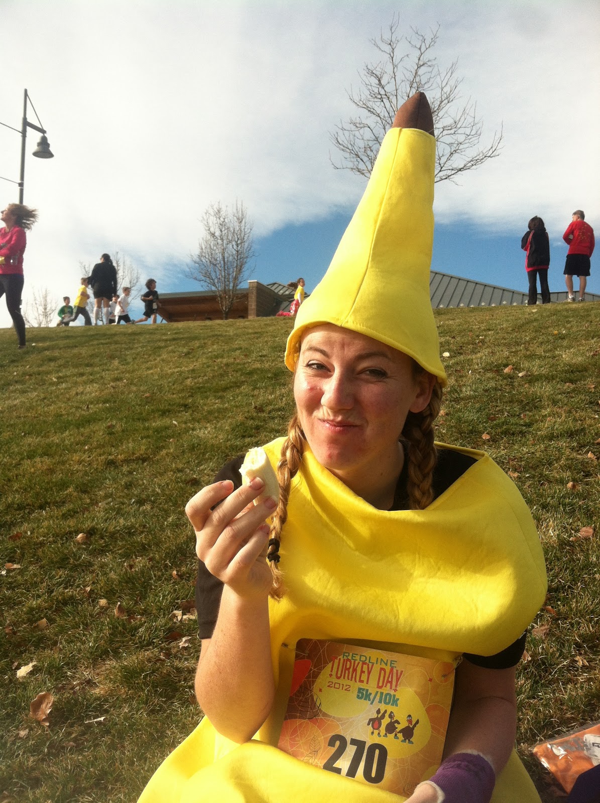 “We could dress up as a banana and a gorilla!!” They were definitely at the first Thanksgiving. “Yah! I’ll try to find a banana costume and if not we’ll do pilgrims or something boring.” And that’s how Molly and I decided to dress up for the Turkey Trot. Somehow my roommate was able to materialize a banana costume for me and Molly already had a gorilla costume (their costume box runs pretty deep). We both lasted about 50 yards into the run before I lost my top (to the wind, found it though) and Molly took off her mask so she could breath. A 5k is one of those distances that attracts all levels of fitness, from those high school cross country kids to the couch potatoes who are just walking it. Any time we passed a kid and their parent the parent would say to the kid, “You’re not going to let a gorilla and a banana pass you, are you?” Clearly because we’re dressed in costumes we don’t exude any level of fitness. It was a good run, neither of us wore watches and weren’t really concerned with our time. Which was good because I’m trying to soften my competitive spirit just until I get my mojo back so I don’t go off getting hurt again.