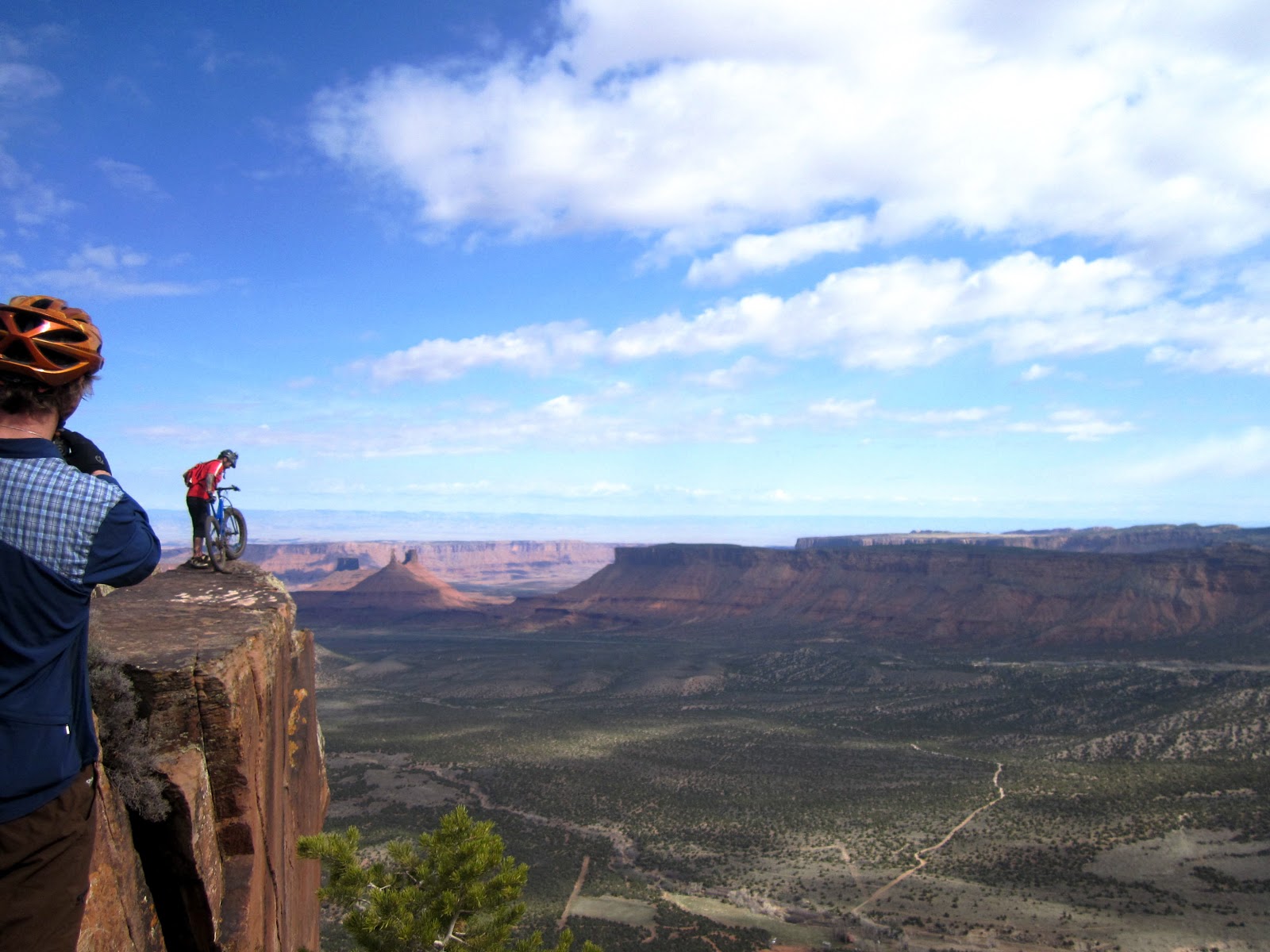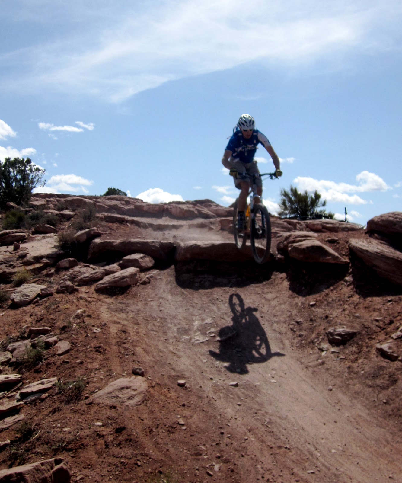The next day before Wayne and I left on the Amasa Back Trail we ran into an old hippy who was telling us about all the deaths so far this season, luckily my mom wasn’t around and none of the deaths were on that trail. It was a jeep trail, which when I first heard that thought it mostly to be like those in South Dakota, well we are not in South Dakota. When we were at our turn around point there was a hole in the rock that led back into a giant opening (which would be the perfect sunroom). Wayne and I climbed up, he had to help me. I thought I would be okay getting down, I mean what would be hard about getting traction from mountain bike shoes on slick rock? Lots, actually. I didn’t want to compromise my short material getting scuffed on the rock so I pushed off a little bit thinking I would just sort of slide down. Which worked until my shoes slid all the way out and I fell directly on the right side of my butt.