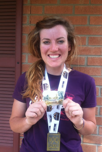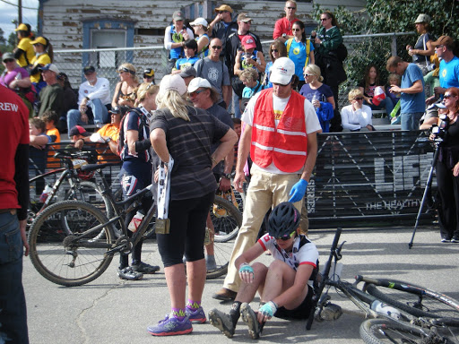 the minute. It certainly didn’t help that the toe I had bashed with a rock in the 50 was acting up. I debated taking my shoe off but that would just make for a longer time on the bike getting to the finish line so kept it on but relished in the thought of crossing that line and taking my shoe off. Exhausted and thinking this race was never going to end I finally saw the High School on the horizon, I was breaching the edge of town. I was so close to finishing and getting this shoe off! I was on paved road. Passing the ER that I spent so many delectable hours in the year before. Cresting the last hill that sends you down into town where there are hoards of people cheering you on. This is finally happening, I hit the red carpet that they put under the finish line and threw my hands up. Done! It was done! I