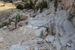 I wasn’t lying either I did feel suprisingly good leaving the aid station so much more than I thought I would at that point. The first 3-4 miles out of the aid station isn’t really much more than short steep ascents and cutting through private property before heading up Columbine. At this point I still haven’t seen the leaders, which I had mentally prepared to see them a lot earlier. This is the section of the course that I’ve done more training rides on than any other section. Mainly because after the crash I wanted to be so familiar with it that I could anticipate every minuscule detail in change of topography and react before waking up in the hospital again. Still I was never able to fully replicate race day on a training ride. The first two miles into the climb weren’t bad and I was able to somewhat get into a rhythm, I had practiced knowing when to shift, when to get out of the saddle and climb but not having a lockout and different gear ratios threw me off bit. The lockout really isn’t that essential especially since Sully put enough air in the fork that I wasn’t really losing a lot of energy when I got out to climb. By mile 48 I was starting to fumble, I was getting passed by more people than I was passing and my stomach was starting to act up. I soon realized that my stomach distress was related to my Lilliputian-sized bladder and taking in more fluids than normal. Just get to Mile 50, that’s all you have to do then you can pee, put on arm warmer’s, eat food start the descent back and then see Wayne and Sully again. At mile 49 the gravel road funnels into a narrow double track with loose, rocky sections that is rideable when other people aren’t trying to walk it. I rode up the first section and it quickly plateaus before another ascent. I soon realized I would be walking with everyone else as the trail isn’t wide enough to accommodate walkers, and riders going up and down. The line seemed long but at last hope was in sight, getting so close to mile 50! Oh this is marvelous! This is the only part that I wasn’t entirely sure where I was going heading into it, see the road branches off into different routes and the map is somewhat cryptic, at least to me. I’ve gone every which way it could be but still didn’t know which door it would be behind. We kept walking past the really steep path that I was praying we didn’t take. Okay we’re almost to mile 50 (I kept checking my garmin), it must be down to the left just over this false summit, yah that must be it. I finally reached the top of the summit eagerly searching for the turn around point. Those dirty wankers! I see what looks like ants marching in the distance. The