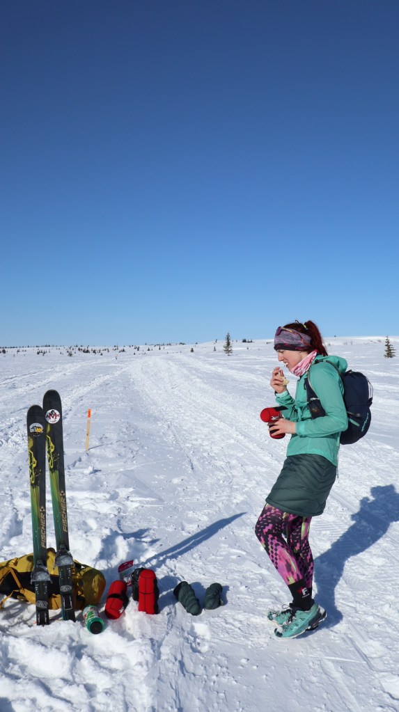 I started skating and I have terrible form but still managed to move faster than those around me with skins. Kick, glide, kick, glide, trying to channel all my physical therapy tools to keep my hips forward, upper body up, and channel my two roommates who actually grew up skate skiing. I got to the bottom of a big uphill, net loss my ass. The guy next to me took his skis off to boot pack. I opted for the same approach, realizing that transitioning twice would take longer and because I mostly penguin walk up hills figure it would be the same amount of time but just different muscles. I got to the top, put my skis back on and started back with the skating. I had no idea how much further I had to go, I opted to not race with my watch but did have the mileage on my phone but it wasn’t exactly easily accessible. I made sure to keep eating and drinking.