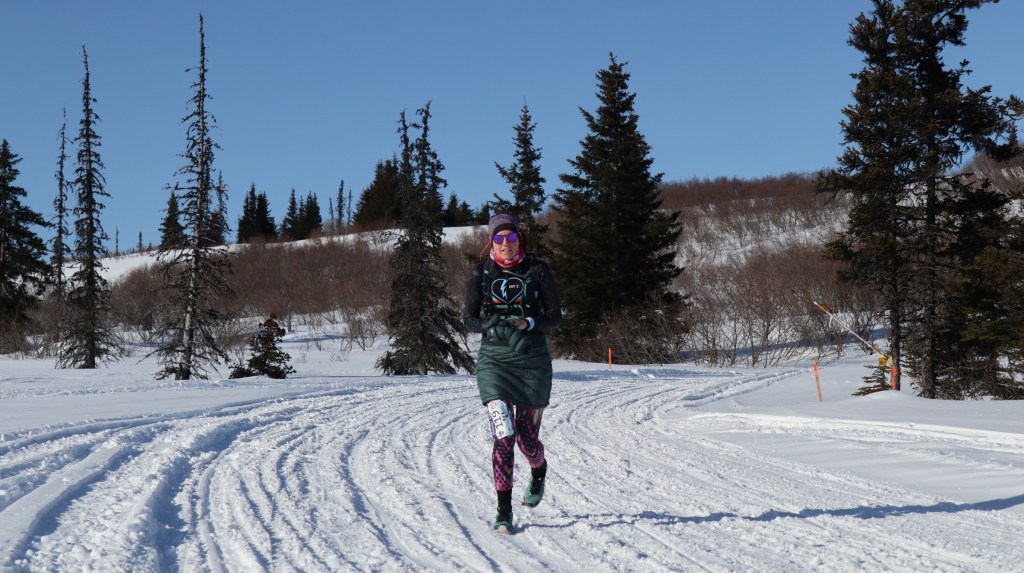 I got to the final transition for the last descent. Another volunteer was directing where the line was. I looked down and while tracked out it didn’t seem like any powder at this point. I stood there for a moment and a guy came up behind me. “You’re the girl without the heel piece right?” I looked at him and said that was me, he told me to be careful on this descent. Sometimes I get annoyed when that happens but he had genuine concern in his voice as if he realized how easy it might be for me fumble this one. I let him take the first line so I could follow. I started going down and it was definitely a bit of survival skiing. I followed the tracks but the snow had gotten a bit more harder packed, I leaned onto my right leg to cut the turns. My legs were a little tired at this point and the hill down was pretty long, I stopped to release my legs and straighten them out. I noticed the guy in front of me would occasionally glance back, as if to make sure I was still okay in my descent. With a few more stops (it was a long descent) I made it to the bottom and the final check-in. They said there was an angry moose so a bit of a course reroute. But still about 6 miles from the finish but overall a net loss. In talking to people it also seemed like the best approach was to skate ski until you couldn’t and then put skins on. In all my winter skiing this year, I had done about 30 minutes of skate skiing total.