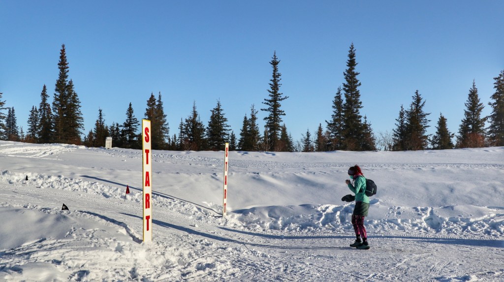 I shoved the rest of my layers into my bag anticipating having to put them on at the start line as previous years it had been -20. I had almost left the house when I realized I needed my skis. I grabbed them and got in the car, leaving the house a little later than I had planned but fortunately everything is close. I looked at the temperature in the car, 20 degrees. That can’t be right. I got to the school, put some last minute things in my bag, my helmet and headlight on and headed to the start. In talking to people the night before it seemed like the start tactic would be to go without skins and skate. I’m not a fan of skate skiing but figured they knew best. I slotted into the start and made conversation with the girl next to me, it was also her first time. She said she thought I was very serious because of my skinsuit, I told her I borrowed it from a lady at the bar last night so not that serious.
