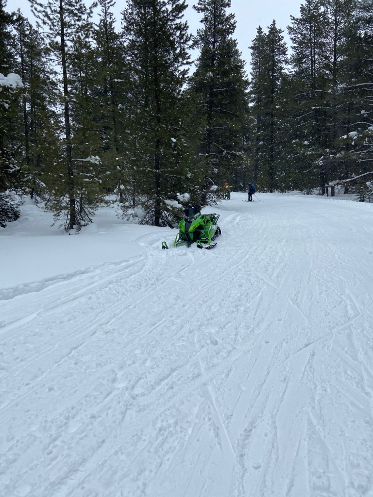 I was skating along when a snowmachine pulled up with Zach and Sam on it. I stopped and we chatted for a bit, offering them my sour patch kids, they told me I was close to the finish. I told them about the day and they told me where they were headed to ski. Sam said his machine had broken down about 100 yards from the finish so when I saw it I would know I was close. I thanked them and headed back on my way. It was around here that I thought about switching skis, my right leg had been attached to the heel piece for all of skating but my left leg was stronger so thought by switching maybe I would get a little further each time. I stopped and switched skis with my right heel being free now. I went to push off and it was like my brain stopped working, I could not go forward with any grace. I started laughing, how is this happening. I switched my skis back and wondered if anyone just saw the calamity. I started skating again and saw the course deviate a bit, I took my glove off to grab some sour patch kids and when I went to put it back on I couldn’t find it. I looked behind me and some lady said she would grab it, I stopped and waited offering her candy in exchange for my glove which she took some candy. I got up a short pitch and a woman on a fatbike rode by saying the finish was just around the corner and all downhill from there. I was skeptical but then I saw Sam’s snowmachine.