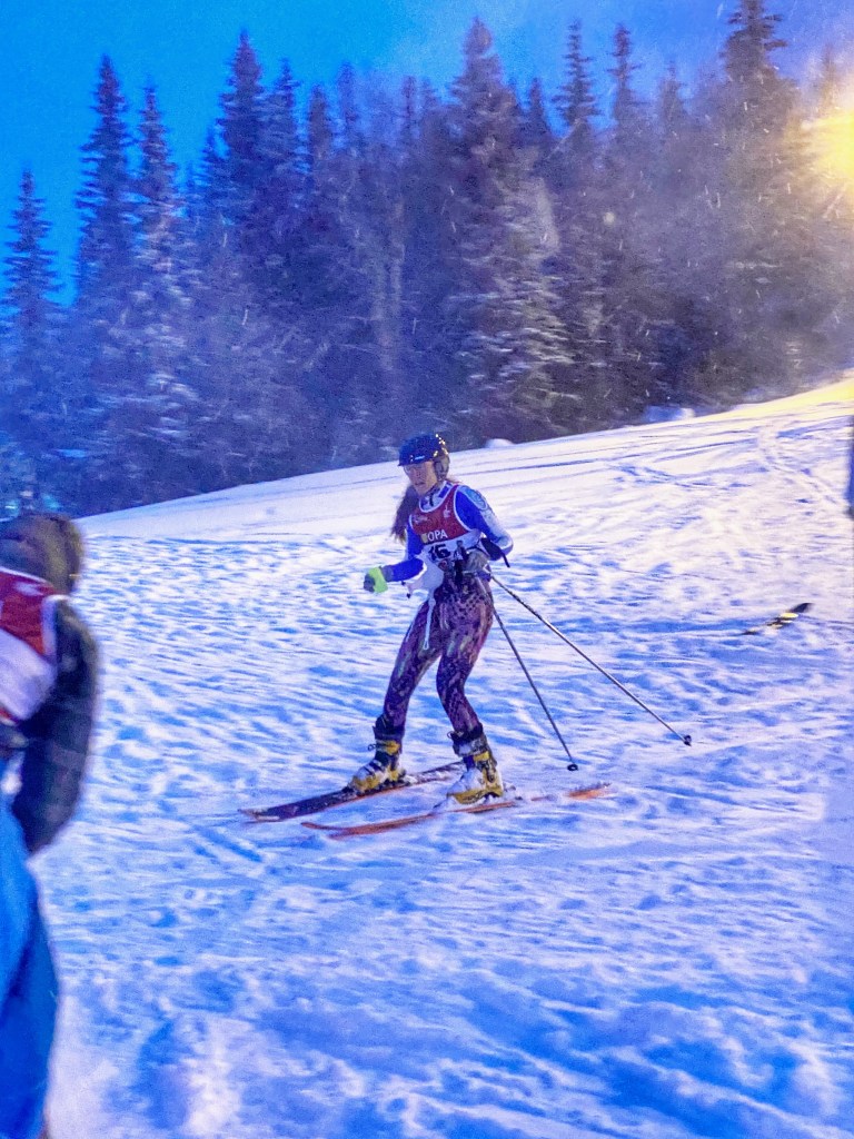 The race started with us running to our skis, getting into the bindings and taking off uphill. I actually felt like I had a somewhat decent start for not knowing what I was doing. I made a comment to another cyclist that ‘this is a bit different than cyclocross’ and kept gliding uphill (trying to channel my inner Dottie Hansen, “gracefully and grandfully” but in reality probably looking more like Marla…). I was about halfway up when I looked up to see people starting to reach the top, and felt one of my leg’s lose traction, I looked down and my skin was lying in the snow behind me. I picked it up and shuffled off to the side taking my ski off to reapply it. I fumbled with it for a bit and put it back on, okay round 2, only to make it a few shuffles and have it pop off again. Por que, why is this happening. I stopped, put it back on again and looked up to realize I was dead last. I made it to the top without any more hiccups but was also conscious to have my ski keep contact with the ground. I got to the top, got a card, transitioned, stuck my skins down my tights as I was informed to do (cycling has left me with so little modesty #kiddingmom, kinda), and took off down the hill. Bonus about being last, not a lot of traffic going down, which I was grateful for because I’m still a bit cautious about the whole downhill speed/brain injury thing (you’re welcome mom).