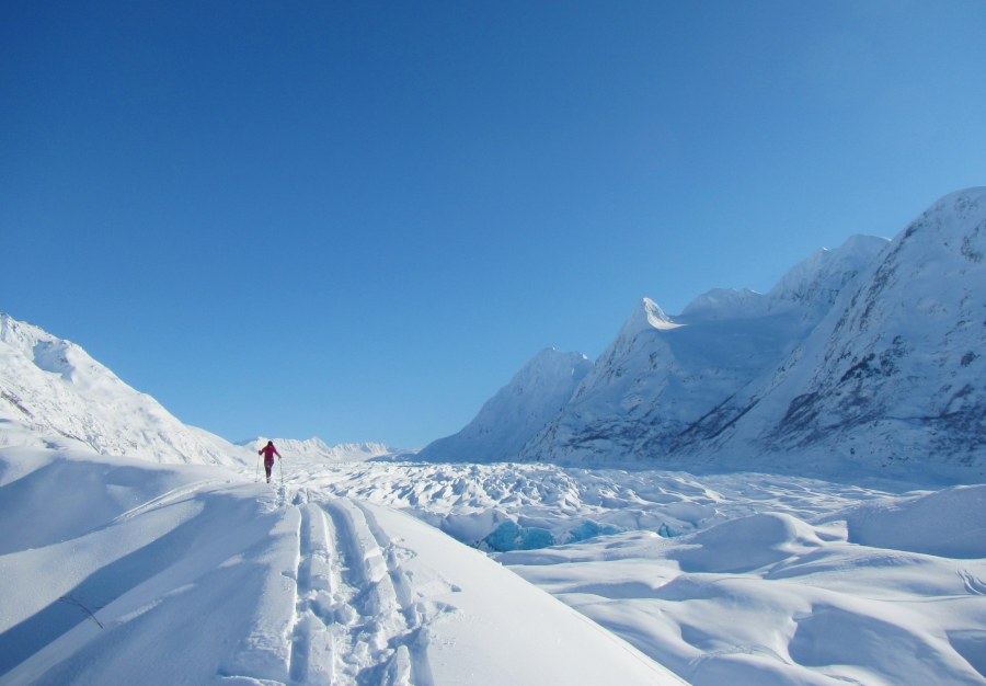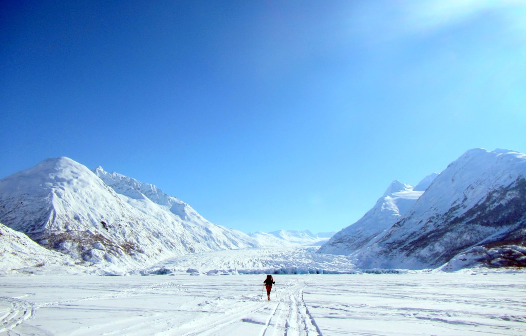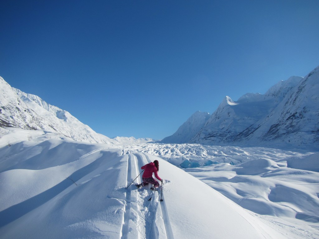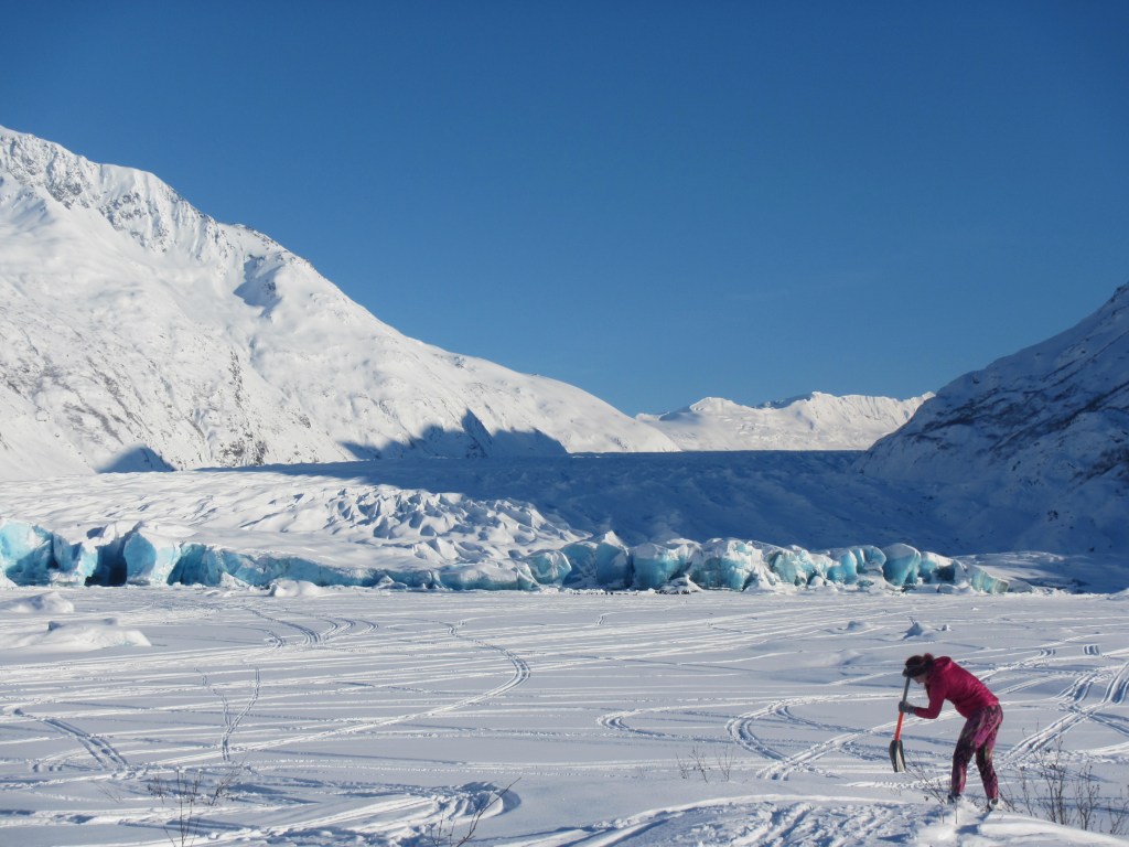 I won’t bore you with too much of the details getting there, we skied in a about 10 miles along a mostly flat riverbed area and then found a camp spot near the glacier and set up before going exploring.