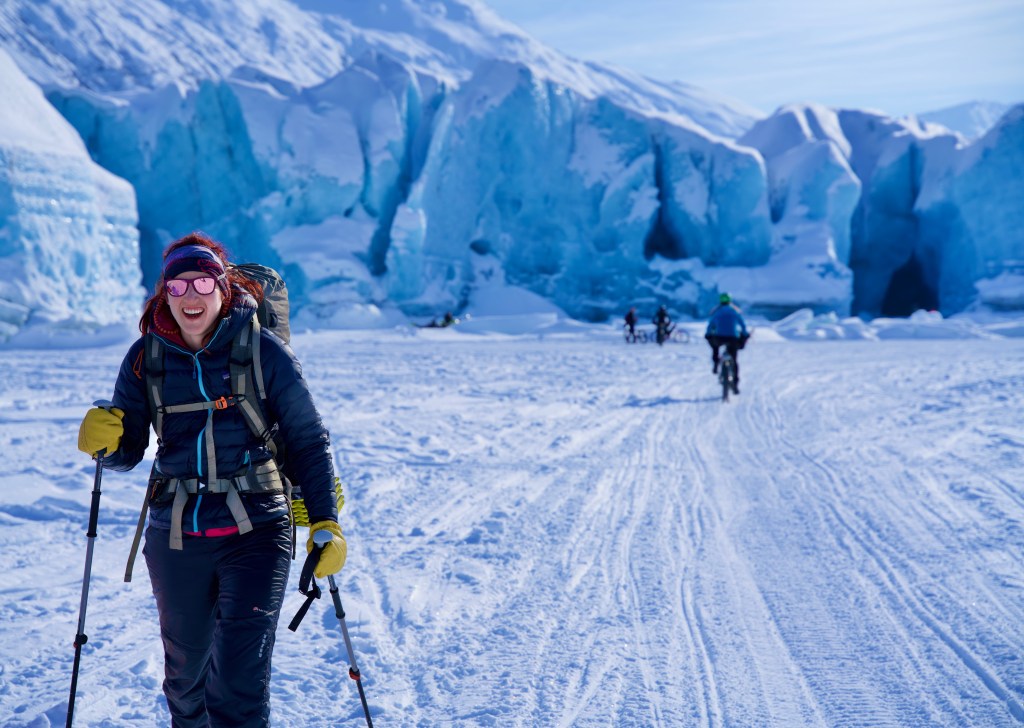 I survived that night with the mantra, you might not ever be comfortable but you won’t die. Being in a -20 degree sleeping bag and almost every piece of puffy clothing I owned I was actually quite comfortable and only found out the next morning I had slept with the back of the sleeping bag covering my face (thought it was a little hard to breath at times but was also quite warm so…). We packed up in the morning and skied by the glacier before running into some friends on bikes. The ski out was nicer than the day before and I slowly peeled off all my puffy layers.