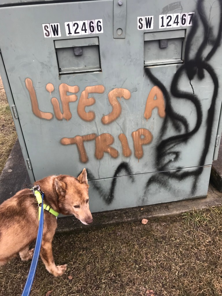 Maybe some of this coupled with it being Alvin’s first overnight camp trip was on my mind when I had Alvin hooked around my waist and hiking up Point Hope. He’s been really good (mostly for maybe having no training in his life) but does pull sometimes. I was seated on the ground digging something out of my pack when he saw a puppy approach and he lunged for it. The belt had slid up above my hips and onto my stomach and so when he lunged, he performed the heimlich maneuver on me, which felt like getting the wind knocked out of me. And then just for good measure he did it two more times. And then I started crying, and it’s never about what you’re crying about–like when I bought the wrong size bed, it wasn’t about the bed it was about having a brain injury and dealing with that. It’s like all this uncertainty hit me and I couldn’t see how I was going to move forward.
