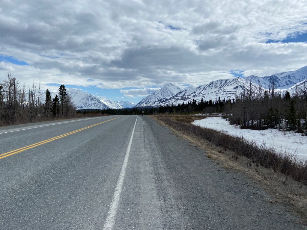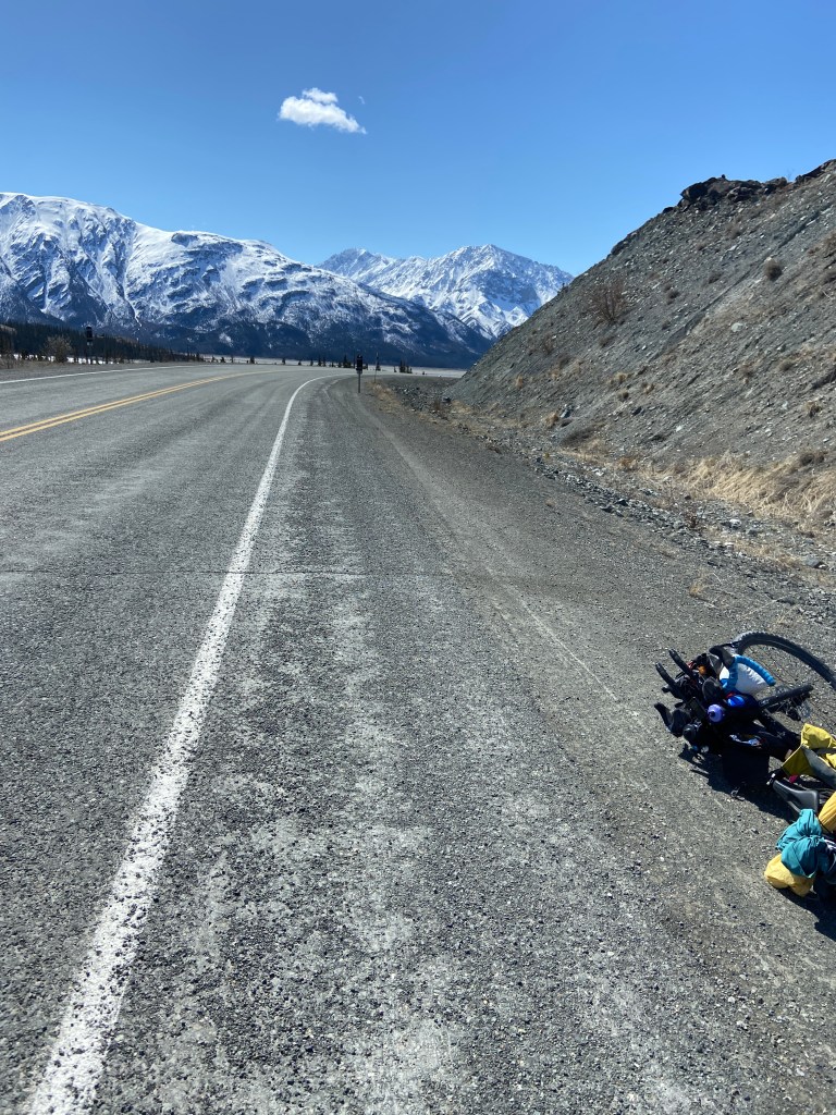 Ana and I got together again and rode in tandem for a bit stopping before a long descent into Haines Junction. I told her about the book but stopped short of reliving my sob fest. At this point both her and Grande knew about the panic attack, I mean there is a lot of silence to fill, but this felt like mine to keep to myself, the grief that can’t be shared, and if she noticed she didn’t say anything. We sat on the side of the road, me laying down more, and talked about how tired we were. I told her I was tired but not as tired as the 250 but more tired than a normal ride of only 40 miles. The cold night before and lack of sleep really took a lot out of us and we were feeling the miles catching up with us today. We ate some food and didn’t really talk about anything other than making it to Haines Junction before the bakery closed.