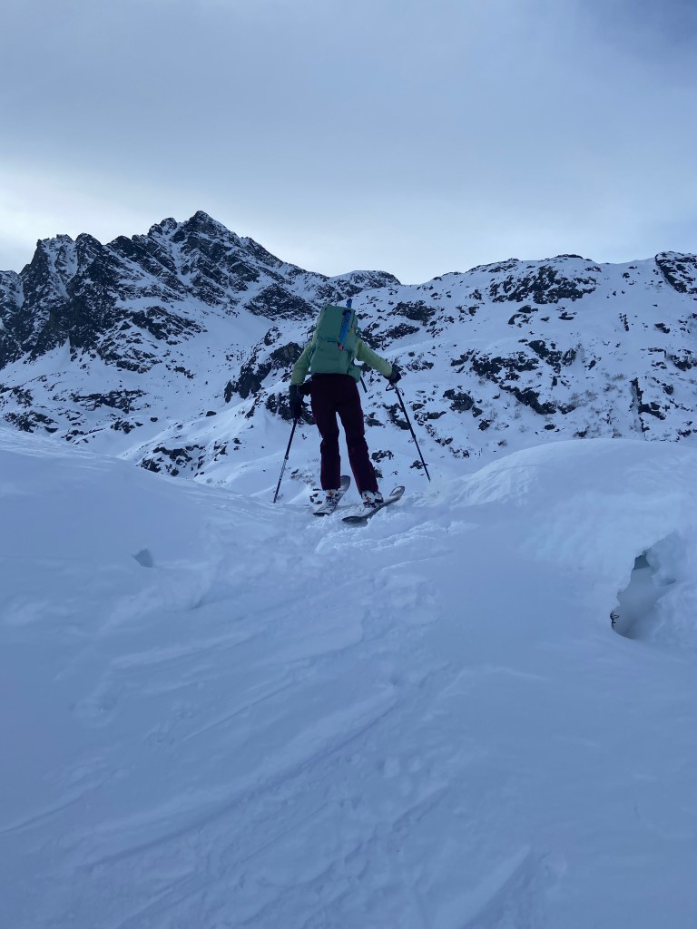 Going across the avalanche debris made me grateful that I had taken my wider skis, having to navigate around chaotic masses of snow, ice, and whatever else had been picked up during the slide. I always think about this when I’m out in the backcountry, if one releases (again, Mom, I’m never in those areas) and the turmoil of getting carried only to then potentially be buried under this massive weight (compacted avalanche debris will weigh in excess of 500 kg per cubic metre). It’s like the snow just settles and immediately becomes like concrete, something like 60% of avalanche victims who died whilst buried show something on the surface but it can take a large effort to extract them– and that’s if they survive the potential trauma. So at least there was some reassurance that they had already slid, until we reached a gully that had only had small tracks of avy debris in it. We stopped and talked about how quickly we could get across and which line. I went first and skied in and popped out as fast as I could hitting ice on the other side and traversing down the hill side to the next debris field where I turned and watched Charlotte. There is always a moment in these situations where you run through worse case scenario, if something slid. But worst case scenario didn’t happen and Charlotte popped up the gully and traversed down to where I was.