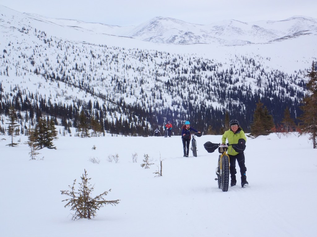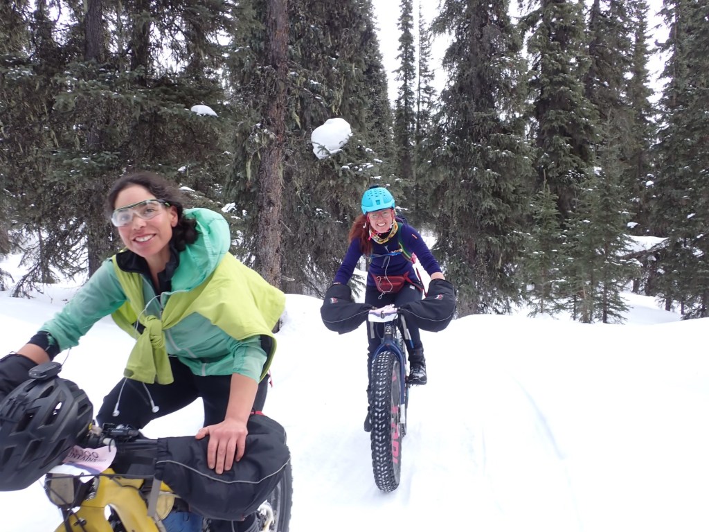 A few miles later I saw Grande in the distance and worked to try and catch her realizing that riding with her would be better than riding by myself, plus I hadn’t printed off course directions. I was able to catch up to her after a bit and sat on her wheel while we chatted, we would take turns in the front with me leading the on the descents and her leading on the climbs but coming back together on the flats. We rode this way to the next check-point, Cache Mountain Cabin (mile 40), both deciding that we didn’t want to take too long. We got to the cabin and they had boiled potatoes, I loaded mine with salt and bacon and ate it before pocketing two more potatoes for later. I filled my camelbak with warm water as the hose had melted out and I had been able to drink some water in between aid stations. We made small talk with the volunteers asking about trail conditions, where they snowmachined in from, and one commented about the antler in my bag. I grabbed some more tang and we headed out. The next section would bring us over a pass and onto the ice fields.